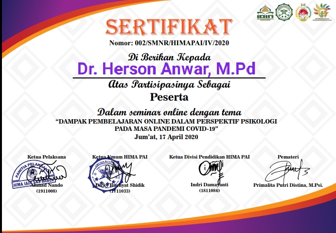 Sertifikat Seminar Online Dampak Pembelajaran Online